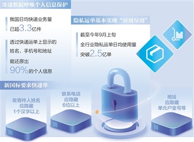 当前,我国日均快递业务量已超3.3亿件,由此产生的大量寄递数据,给个人信息保护带来严峻挑战。为此,快递行业正加快推广应用隐私运单,通过加密处理等技术手段,给快递个人信息加把“安全锁”。