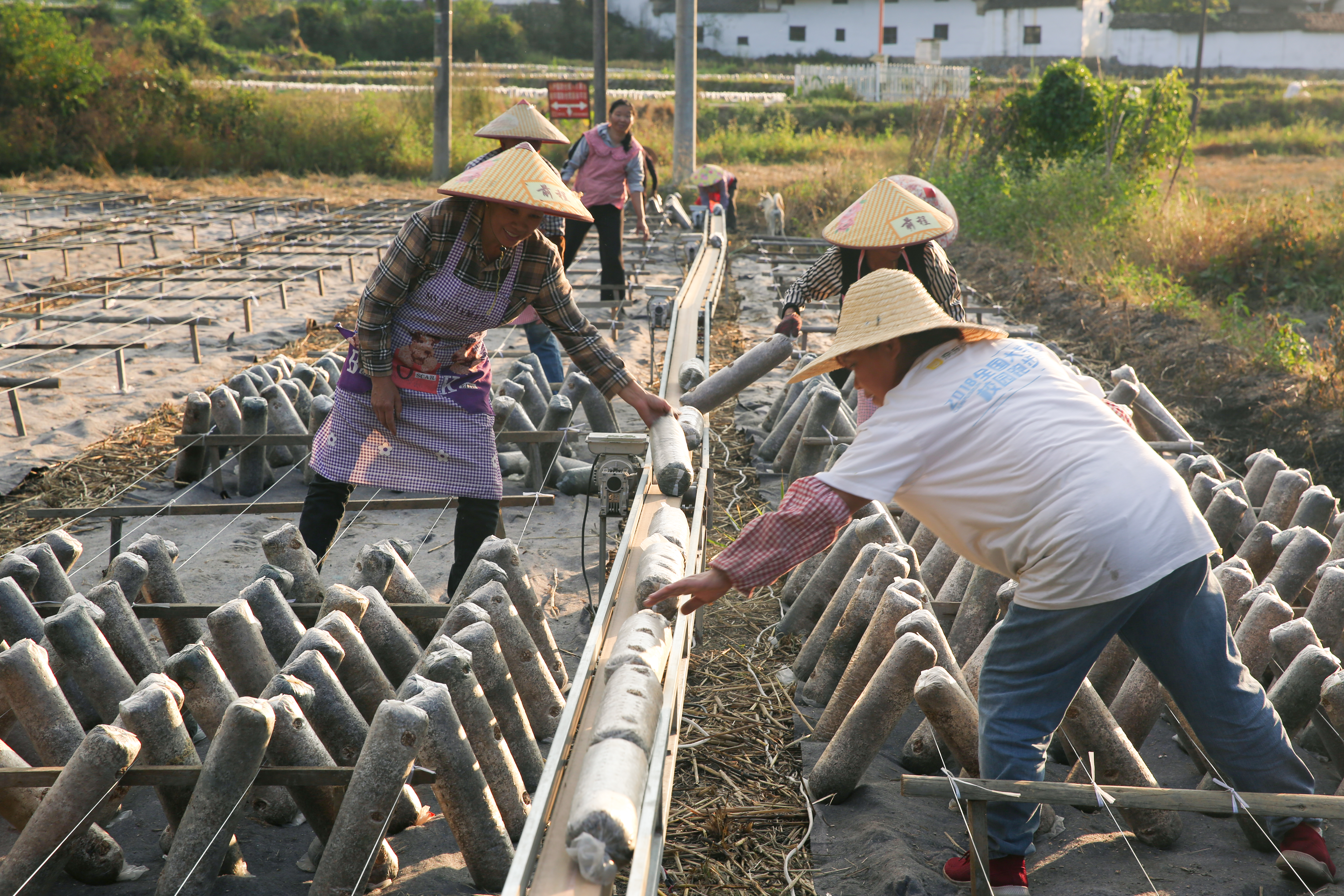 浙江省云和县赤石乡麻垟村的稻耳轮作小微产业园里,村民们在已收割的稻田里码放菌棒。新华社记者李泽欣 摄