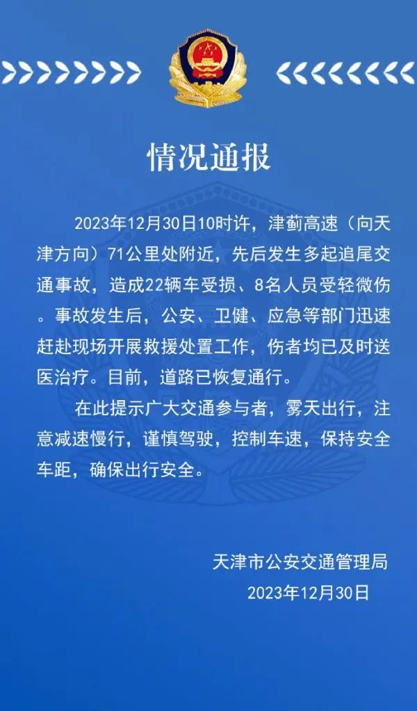 12月30日13时许,@天津交警发布通报称2023年12月30日10时许,津蓟高速(向天津方向)71公里处附近,先后发生多起追尾交通事故,造成22辆车受损、8名人员受轻微伤。