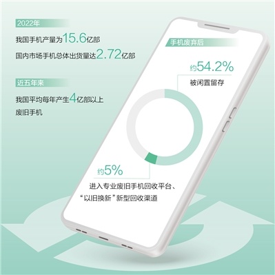 废旧手机是保有量和报废量增长快、难以处置的电子废弃物之一。中国循环经济协会估算,近5年来,我国平均每年产生4亿部以上废旧手机。同时,该协会的一项研究结果显示,手机废弃后,约54.2%被消费者闲置留存,只有约5%能够进入专业的废旧手机回收平台、“以旧换新”新型回收渠道。