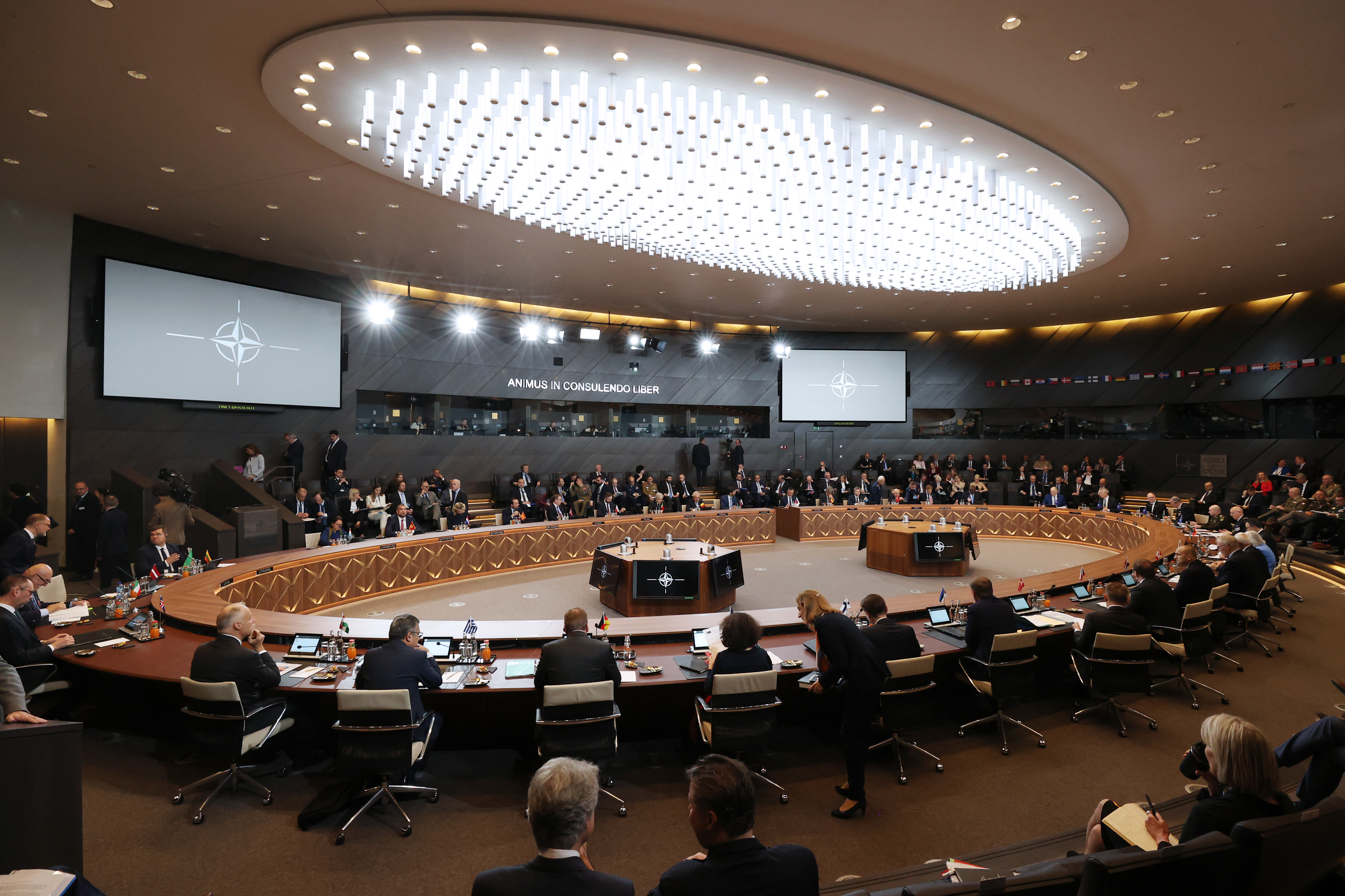 这是6月14日在比利时布鲁塞尔北约总部拍摄的北约防长会现场。北约秘书长斯托尔滕贝格14日说,北约成员国国防部长当天批准了一项旨在由北约协调对乌克兰军事援助和训练的计划。北约防长会13日至14日在布鲁塞尔举行。新华社记者赵丁喆摄